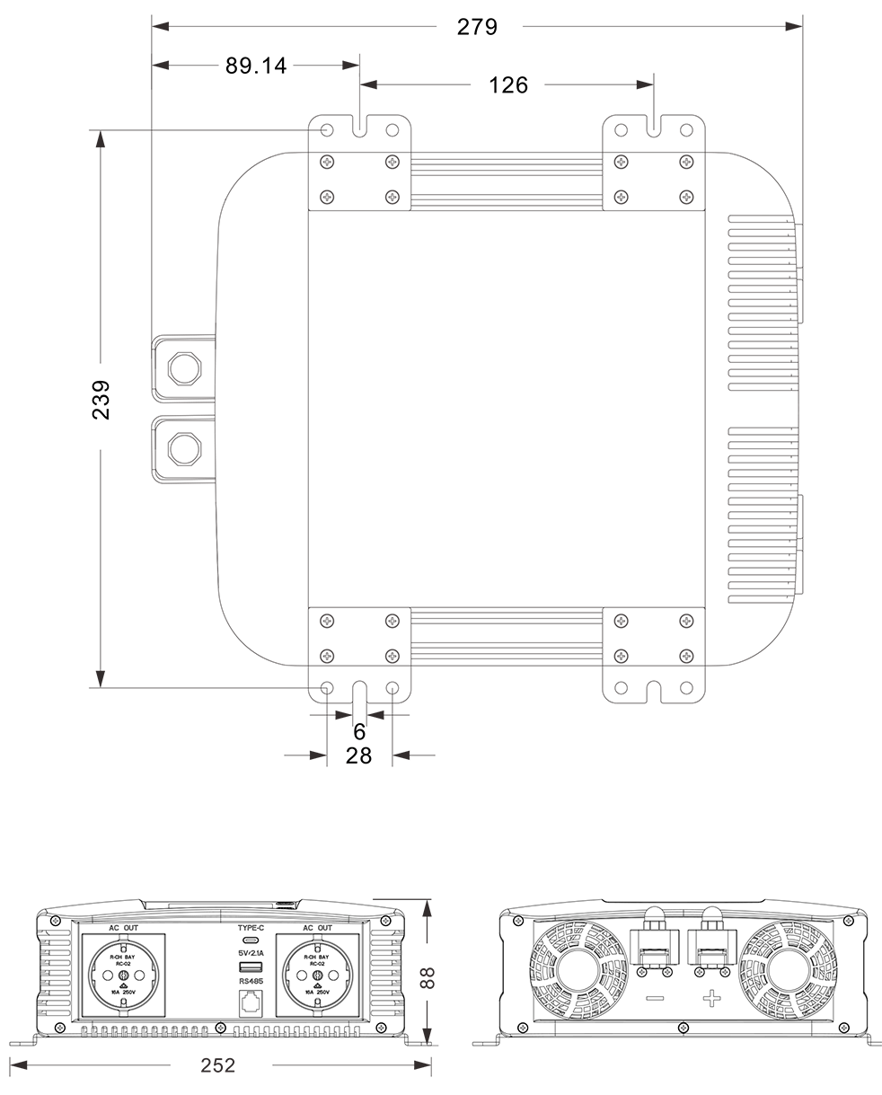 الرسومات الميكانيكية:(279 × 252 × 88 ملم)
