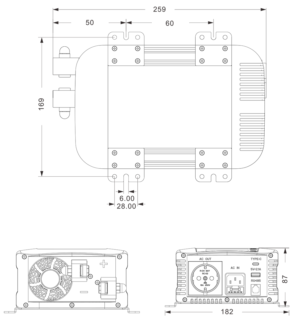 الرسومات الميكانيكية:(259 × 182 × 87 ملم)